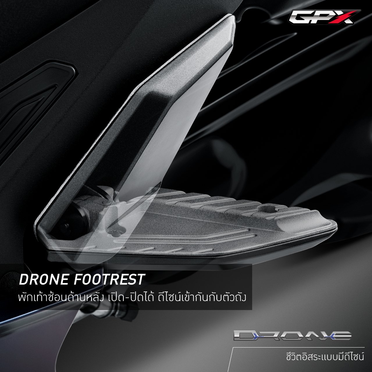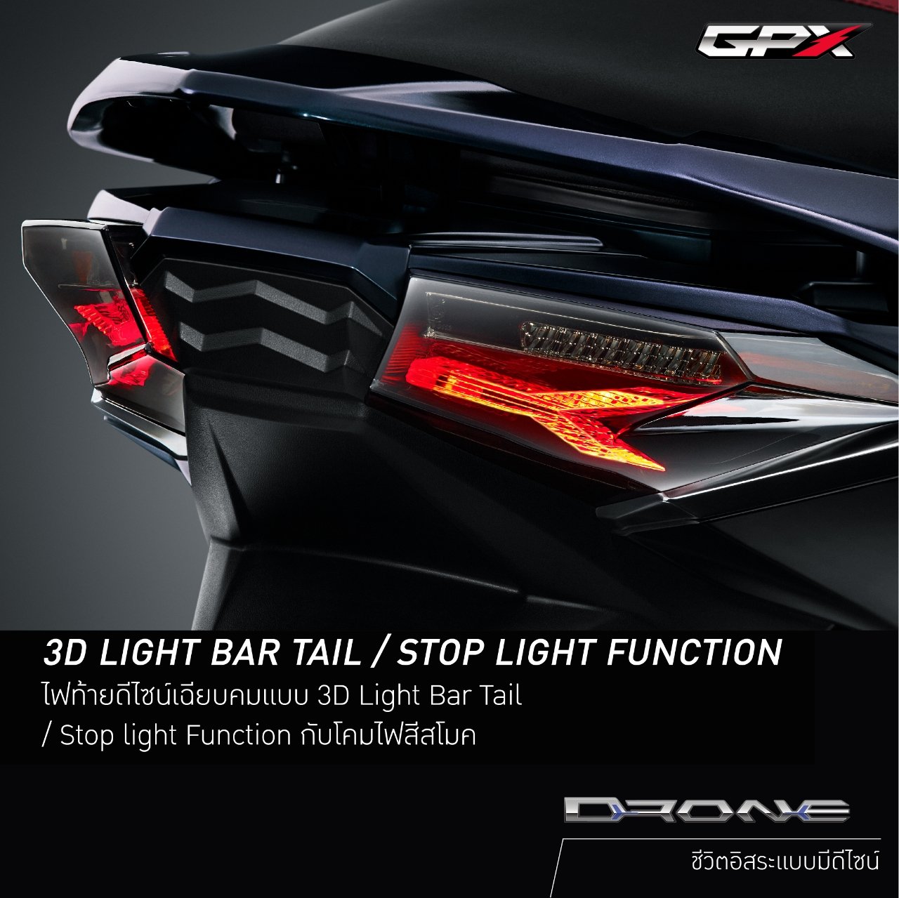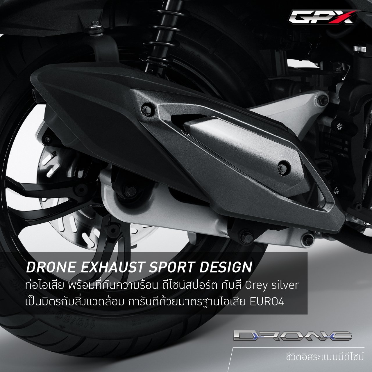ล่าสุด GPX ได้เปิดตัวรถรุ่น ‘DRONE’ อย่างเป็นทางการ เป็นที่แรกของโลก ในรูปแบบ Stream Live ผ่านช่องทางออนไลน์ของ GPX THAILAND เป็นที่เรียบร้อยแล้ว กับรูปโฉมที่หลายๆคนโดนใจ ด้วยการออกแบบมาให้มีความพรีเมียมผสมผสานกับความสปอร์ต เน้นการเดินเส้นสายตัวรถที่เฉียบคม ให้อารมณ์ความดุดัน