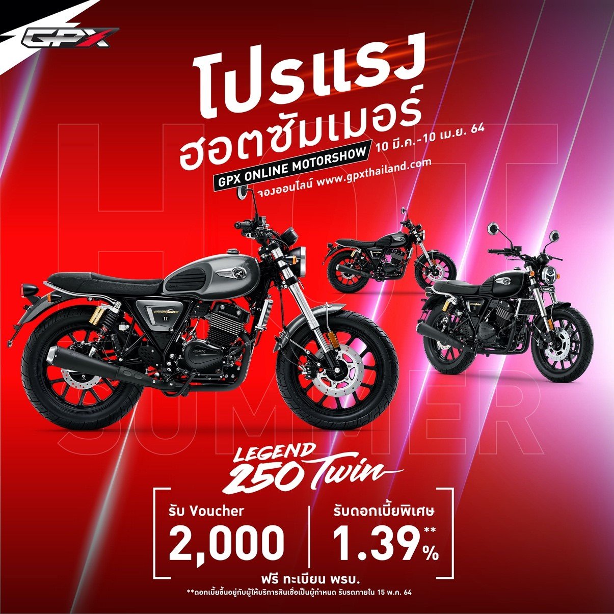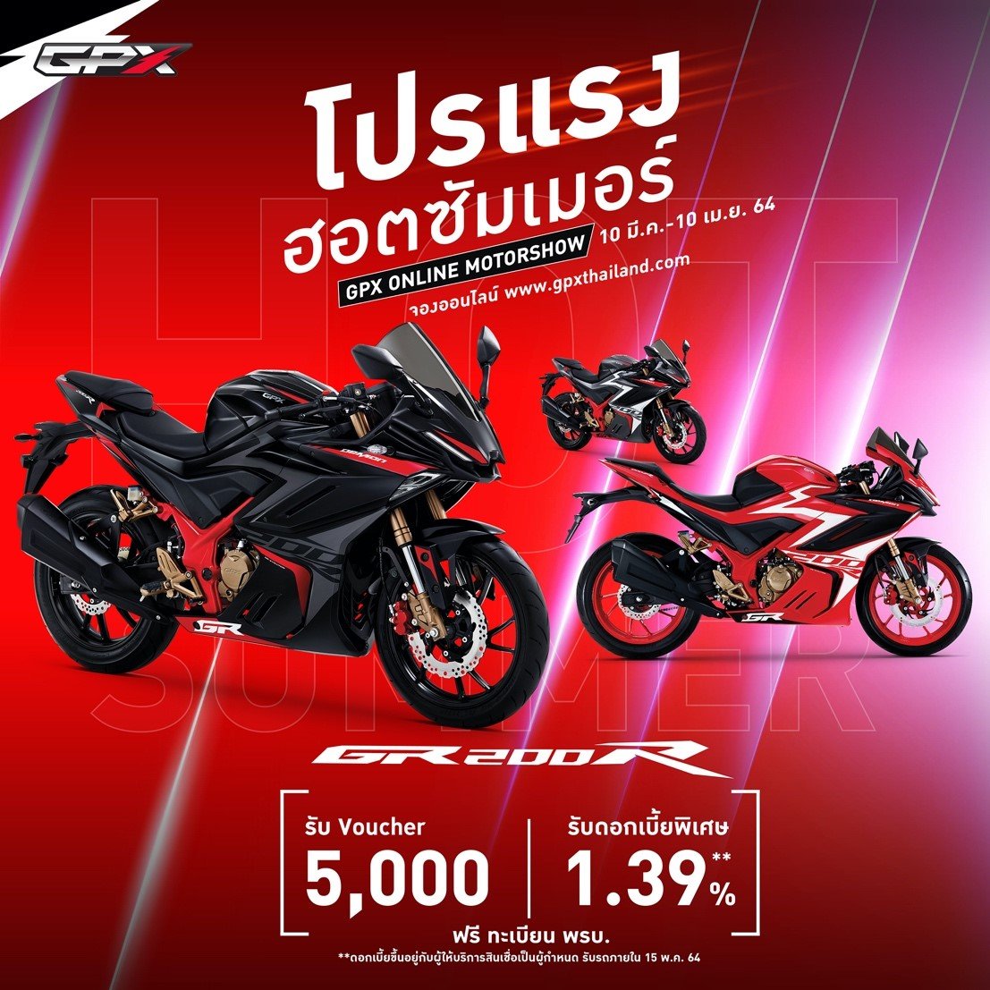 GPX ค่ายรถมอเตอร์ไซค์ดีไซน์โดนๆ ส่งโปรแรงฮอตซัมเมอร์! ขนข้อเสนอสุดพิเศษมามอบให้กับเหล่าไบค์เกอร์ ในแคมเปญ GPX Online Motor Show *สิทธิพิเศษเฉพาะจองออนไลน์เท่านั้น* เพียงจองรถรุ่น DRONE , DEMON GR200R , LEGEND250 TWIN, LEGEND250 TWIN II และ LEGEND 150-Fi ผ่านทาง www.gpxthailand.com ตั้งแต่ วันที่ 10 มี.ค. – 10 เม.ย. 64 นี้! รับส่วนลดพิเศษสูงสุด 5,000 บาท , ฟรี ทะเบียน + พรบ. พร้อมรับอัตราดอกเบี้ยต่ำสุดเพียง 1.39% และการรับประกันนานถึง 3 ปี หรือ 30,000 กิโลเมตร