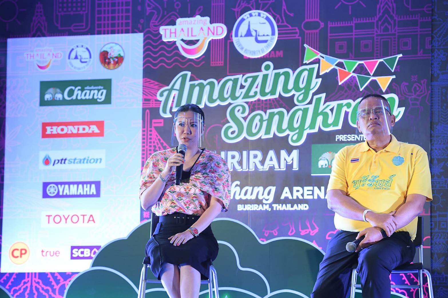 นางสาวฐาปนีย์ เกียรติไพบูลย์ รองผู้ว่าการด้านสินค้าและธุรกิจท่องเที่ยว การท่องเที่ยวแห่งประเทศไทย (ททท.) กล่าวว่า ในฐานะหน่วยงานที่รับผิดชอบโดยตรงในการช่วยเหลือธุรกิจท่องเที่ยว โรงแรม และการบริการที่รับผลกระทบจากการแพร่ระบาดของไวรัสโควิด-19 จึงได้เข้ามาสนับสนุนงาน Amazing Songkran Buriram ในฐานะ Title Sponsor ตามกลยุทธ์ “Event Marketing” ซึ่งเป็นการส่งเสริมศิลปวัฒนธรรมของไทย โดยใช้เทศกาลงานสงกรานต์ เป็น Game Changer ในการจัดกิจกรรม
