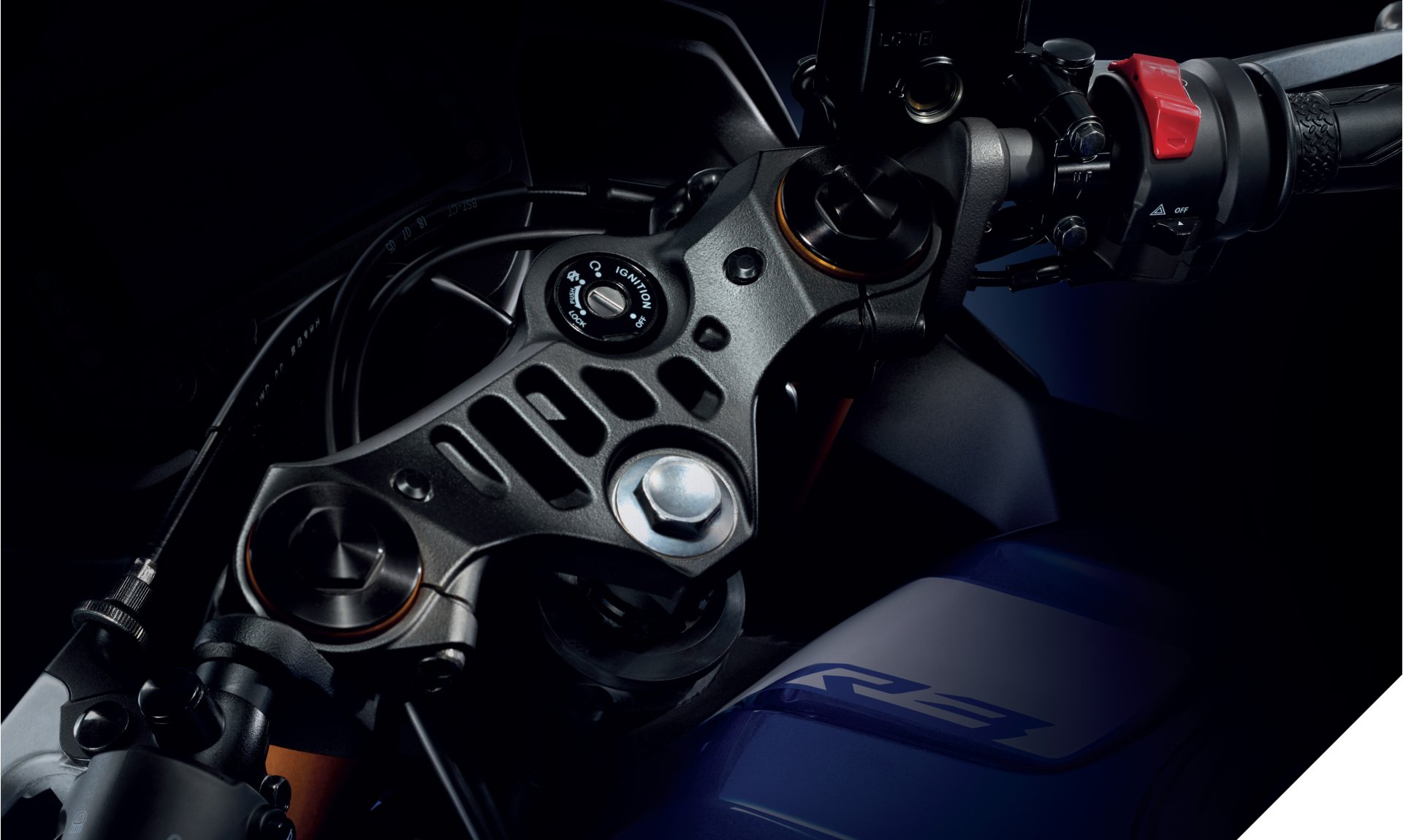 NEW YAMAHA YZF-R3... RIDE THE R ANYTIME สีใหม่! ยังมาพร้อมระบบควบคุม PROUD SUPER SPORTS LOOK ที่จะตอบสนองผู้ขับขี่ได้แบบเต็มอารมณ์รถซูเปอร์สปอร์ต ไม่ว่าจะเป็น Full LCD Meter หน้าปัดแสดงข้อมูลการขับขี่ครบถ้วน สามารถมองเห็นได้อย่างชัดเจน พร้อมไฟเตือนเปลี่ยนเกียร์ (Shift Light), ระบบสวิตช์สตาร์ทเครื่องยนต์ ดีไซน์เท่ล้ำ บ่งบอกความเป็นบิ๊กไบค์อย่างแท้จริง พร้อมด้วย Handle Crown ดีไซน์ลุคซูเปอร์สปอร์ตสไตลิ่ง ให้ความแข็งแรงและลดน้ำหนักได้มากขึ้น