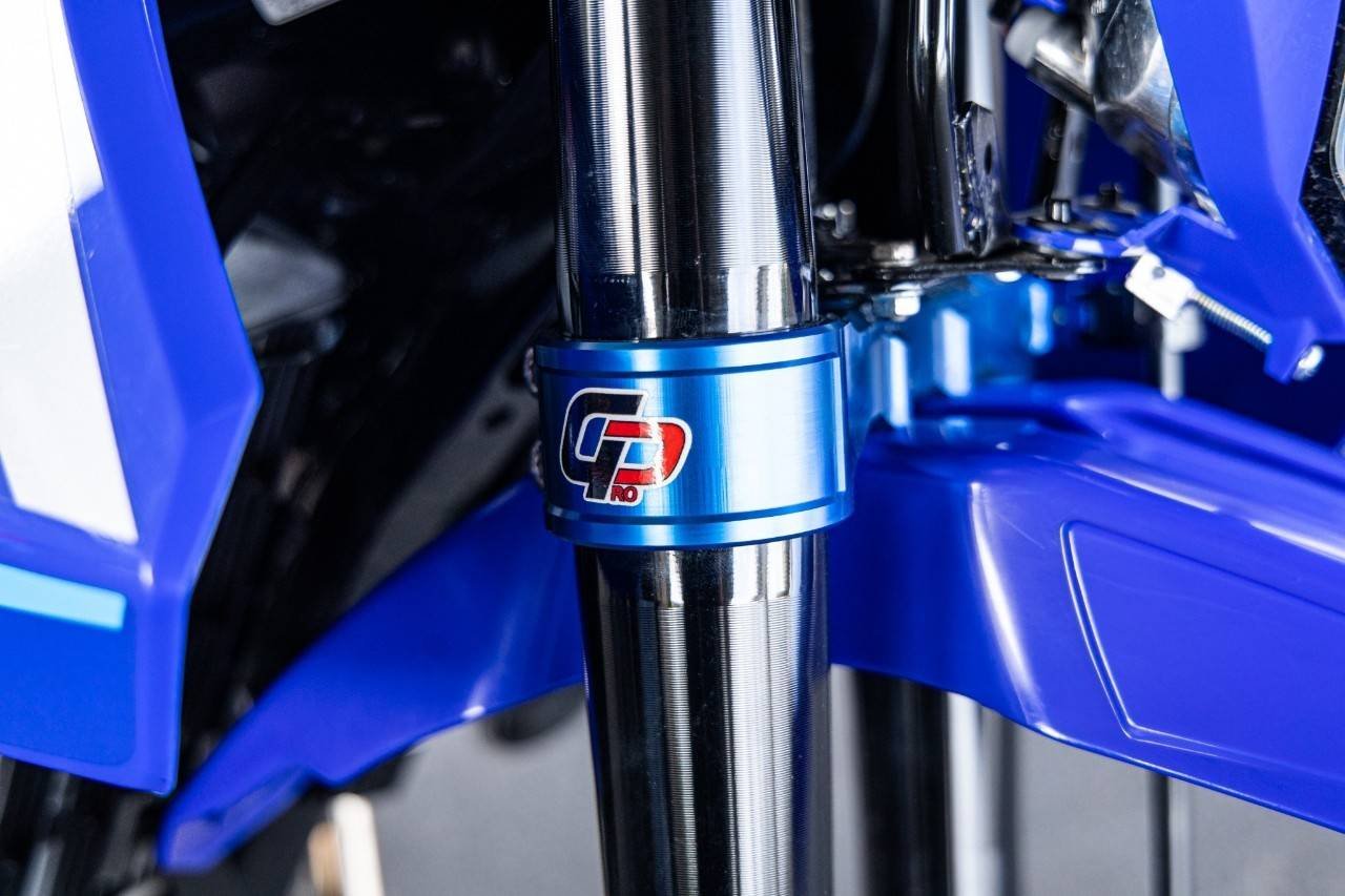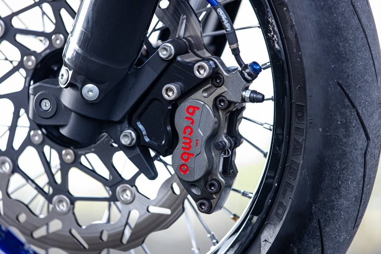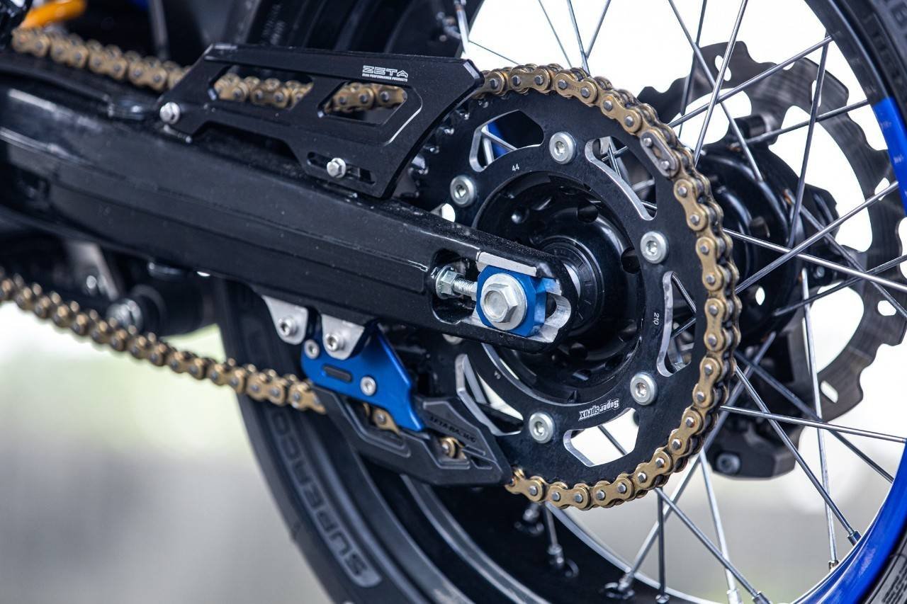 ในส่วนสุดท้ายที่จะขาดไม่ได้เลย ก็คือในส่วนของระบบส่งกำลัง โดยเลือกใช้สเตอร์หน้าเป็นสเตอร์จากแบรนด์พระอาทิตย์....... ส่วนด้านหลัง จัดให้เข้าคอนเซ็ปรถในสไตล์ Super Moto ด้วยสเตอร์อลูมิเนียมเกรดท๊อปสุดแกร่ง ขนาด 44 ฟัน แบรนด์ Super Sporx ส่งกำลังผ่านโซ่ RK MXU เบอร์ 520 แบบมีโอริงในตัว หายห่วงเรื่องความลื่นไหลในการขับเคลื่อน ตกแต่งและใช้งานจริงได้อย่างปลอดภัย ด้วยตัวประคองโซ่ และการ์ดสเตอร์หลังจากแบรนด์ Zeta ส่วนล้อที่เปลี่ยนคาแร็คเตอร์ของตัวรถ จากสไตล์ Enduro มาเป็นแนว Super Moto ได้อย่างชัดเจน ก็ยกชุดใหม่หมด โดยเลือกใช้ดุมล้อแบบอลูมิเนียม CNC ทั้งด้านหน้า และด้านหลัง จากแบรนด์ G Pro ขึ้นซี่ลวดเข้ากับวงล้ออลูมิเนียมทำสีใหม่ โดยวงล้อด้านหน้ามีขนาด 3.50 และด้านหลังเลือกใช้เป็นขนาด 4.50 ขอบ 17 เรียกว่าใหญ่เต็มคำเลยทีเดียว เพิ่มตัวล๊อคยางด้านในจาก IRC และรัดด้วยยางสเปคตัวแข่งท๊อปสุดในรุ่นจากแบรนด์ Pirelli ในรุ่น Diablo Supercorsa SC2 ด้านหน้าขนาด 120 ทับ 70 และด้านหลังขนาด 160 แก้มยาง 60 ขอบ 17 นิ้ว ปิดท้ายกับเจ้าของเสียงทุ้มๆแต่อัดแน่นด้วยความแรงที่มีคุณภาพ กับคอท่อไอเสียสแตนเลส ออกฝั่งซ้ายของตัวรถ มาพร้อมปลายไทเทเนียมแท้ยกใบ ที่ใช้การแปลงและจัดวางตำแหน่งอย่างลงตัว ในแบรนด์ Akarpovic ที่ใครๆก็คุ้นเคยกันดีในรถแข่ง ยามาฮ่า ระดับโลก