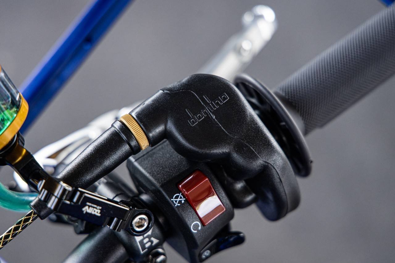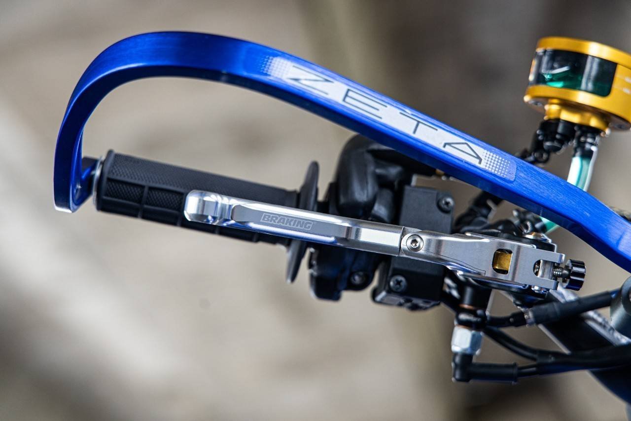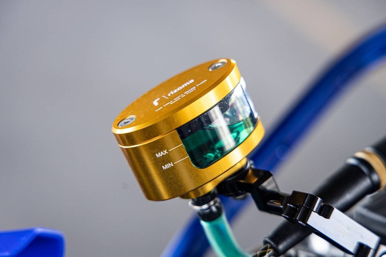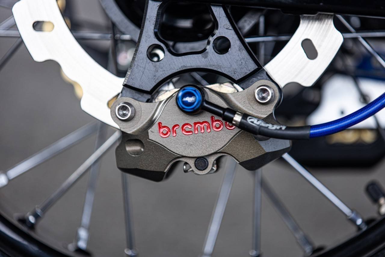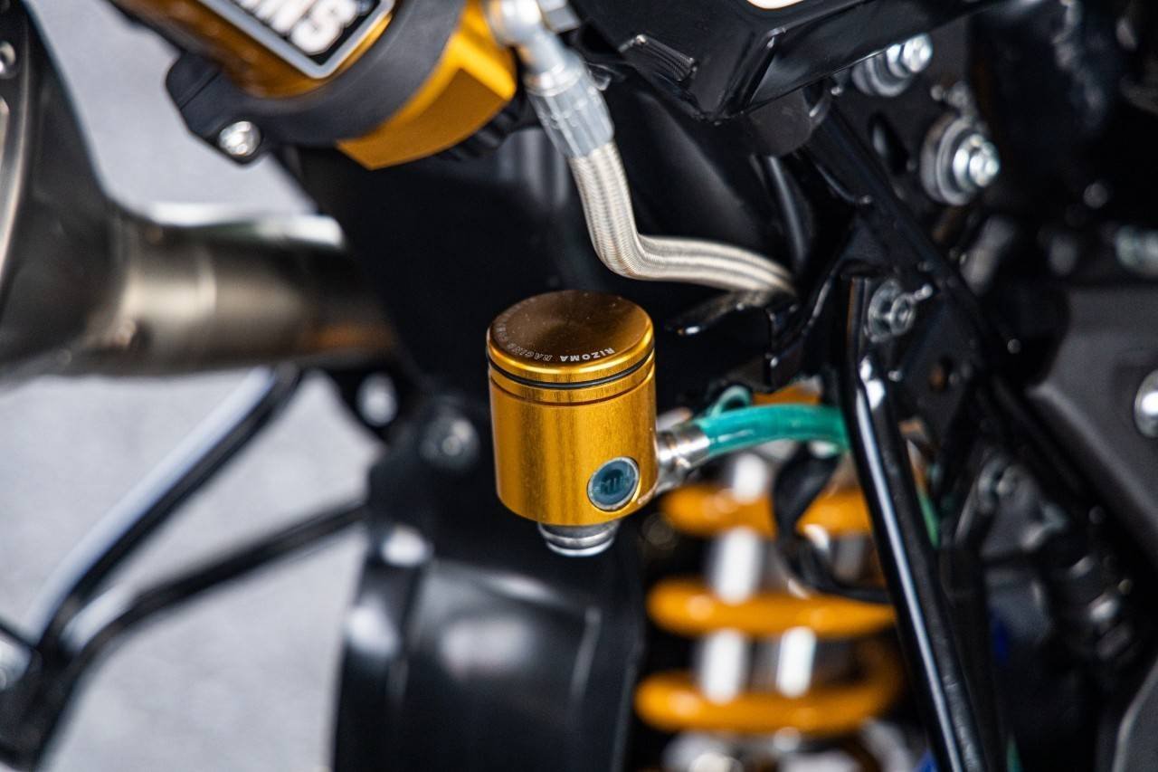 ส่วนระบบเบรกรถคันนี้บอกได้เลยว่าเน้นๆแบรนด์เนมระดับโลกทั้งคันจริงๆ เริ่มจากเบรกหน้า ปั้มลอยตัวท๊อปสุดจากแบรนด์ Braking ขนาดลูกสูบ 15 มิล ตกแต่งเพิ่มเติมด้วยกระปุกน้ำมันเบรกมิเนียม ทรงตู้ปลาแบรนด์ Rizoma พร้อมขายึดประปุกน้ำมันเบรกแบบอลูมิเนียมแบรนด์ DMV เลื่อนมาที่ด้านซ้ายกับชุดมือคลัทช์ของแบรนด์ Zeta ถือว่าตัวดีไซน์ออกแบบมาได้โฉบเฉี่ยว เข้ากันเป็นอย่างกับปั้มบนเบรกหน้าที่อยู่ด้านขวา ชุดสายเบรคทั้งด้านหน้า-หลังดีไซน์ใหม่ทั้งคันโดยใช้เป็นชุดสายเบรก พร้อมฟิตติ้งหัวข้อต่อใหม่ยกชุดจากอิตาลี่ ในแบรนด์ Allegri ซึ่งเป็นแบรนด์สายเบรกที่ใช้จริงในการแข่งขันระดับโลก ต่อที่ปั้มล่างเบรกหน้าเลือกใช้เป็นปั้มเบรก Brembo Racing 4 Pot สร้างขายึดปั้มเบรกใหม่ จับจานดิสก์เบรกโฟลส์ติ้ง ขนาด 320 มิล แบรนด์ Braking ส่วนด้านหลังตกแต่งปั้มกระทุ้งเบรก โดยเปลี่ยนกระปุกน้ำมันเบรกเป็นแบบมิเนียมเช่นเดียวกับปั้มเบรคหน้า โดยเลือกใช้เป็นกระปุกน้ำมันเบรกมิเนียมแบรนด์ Rizoma สีทอง เช่นเดียวกัน ส่วนปั้มเบรคหลังเลือกใช้เป็นปั้มด้วง Brembo Racing 2 Pot จับจานแต่งลายดอกไม้ ขนาด 190 มิล แบรนด์ Braking เช่นเดียวกับด้านหน้า เรียกได้ว่าหล่อยกชุด