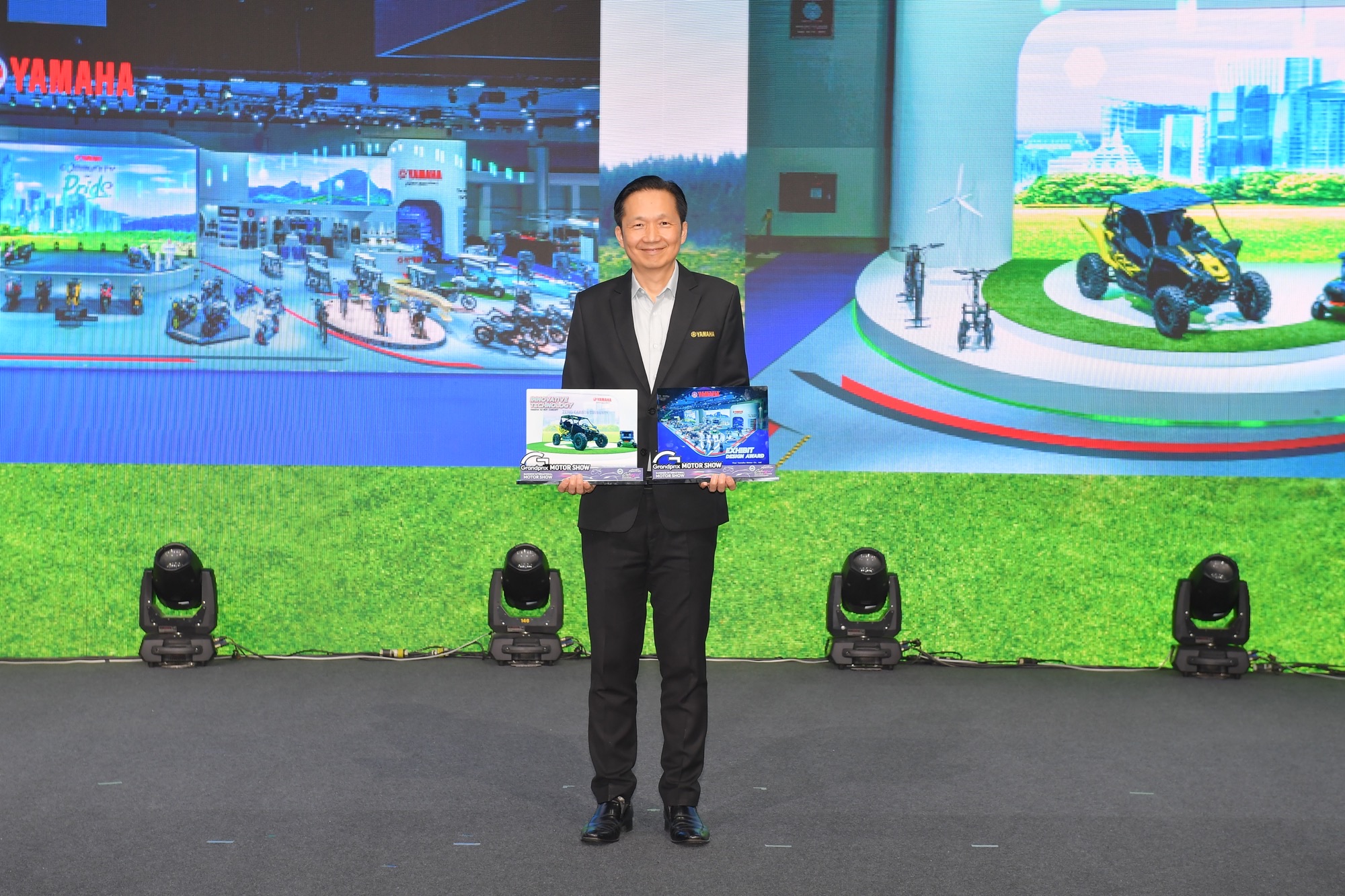 นายพงศธร เอื้อมงคลชัย รองประธานกรรมการบริหาร นายจิรภัทร สายเพชร ผู้จัดการทั่วไปฝ่ายการตลาดกลุ่มรถออโตเมติ กและสนับสนุนการขาย บริษัท ไทยยามาฮ่ามอเตอร์ จำกัด ขึ้นรับรางวัล EXHIBIT DESIGN AWARD การออกแบบและจัดแสดงบูธยอดเยี่ยม และรางวัล INNOVATIVE TECHNOLOGY AWARD ผู้นำนวัตกรรมและเทคโนโลยียอดเยี่ยม จาก ดร.ปราจิน เอี่ยมลำเนา ประธานกรรมการบริหาร / ประธานเจ้าหน้าที่บริหาร นายจาตุรนต์ โกมลมิศร์ ประธานเจ้าหน้าที่ปฏิบัติการมอเตอร์โชว์ บริษัท กรังด์ปรีซ์ อินเตอร์เนชั่นแนล จำกัด (มหาชน) ผู้จัดงาน บางกอก อินเตอร์เนชั่นแนล มอเตอร์โชว์ ครั้งที่ 44
