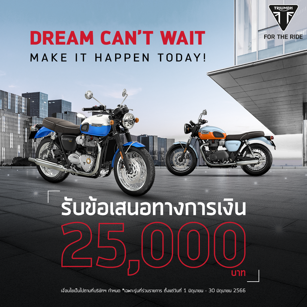 กรุงเทพฯ 2 มิถุนายน 2566 - ไทรอัมพ์ มอเตอร์ไซเคิลส์ มอบข้อเสนอสุดพิเศษในการเป็นเจ้าของไทรอัมพ์ โมเดิร์น คลาสสิก อาทิ “บอนเนวิลล์ ที100” (Bonneville T100) “บอนเนวิลล์ ที120” (Bonneville T120) และ “บอนเนวิลล์ ที120 แบล็ค” (Bonneville T120 Black) และ “สปีด ทวิน 1200” (Speed Twin 1200) รถจักรยานยนต์ระดับตำนานในฝันของใครหลายคนได้ง่าย ๆ ด้วยข้อเสนอทางการเงินสูงสุด 25,000 บาท ที่มาพร้อมฟรี ค่า พ.ร.บ. ค่าจดทะเบียน ตลอดจนบริการช่วยเหลือฉุกเฉินบนท้องถนนตลอด 24 ชั่วโมง (Triumph Roadside Assistance) เป็นระยะเวลา 2 ปี และการรับประกันคุณภาพ Triumph Warranty สูงสุด 2 ปี แบบไม่จำกัดระยะทาง ไม่พอ! ยังชวนแฟน ๆ มาทดสอบสมรรถนะของรถจักรยานยนต์ไทรอัมพ์รุ่นที่ชอบรุ่นที่ใช่ผ่านแคมเปญ “Is This Your Dream? ...ความฝันของคุณหน้าตาเป็นแบบนี้หรือเปล่า?” โดยไม่มีค่าใช้จ่าย พร้อมรับของที่ระลึกสุดพิเศษฟรีทันที ตั้งแต่วันนี้จนถึงวันที่ 30 มิถุนายน 2566 ที่โชว์รูมและศูนย์บริการไทรอัมพ์ทั่วประเทศ