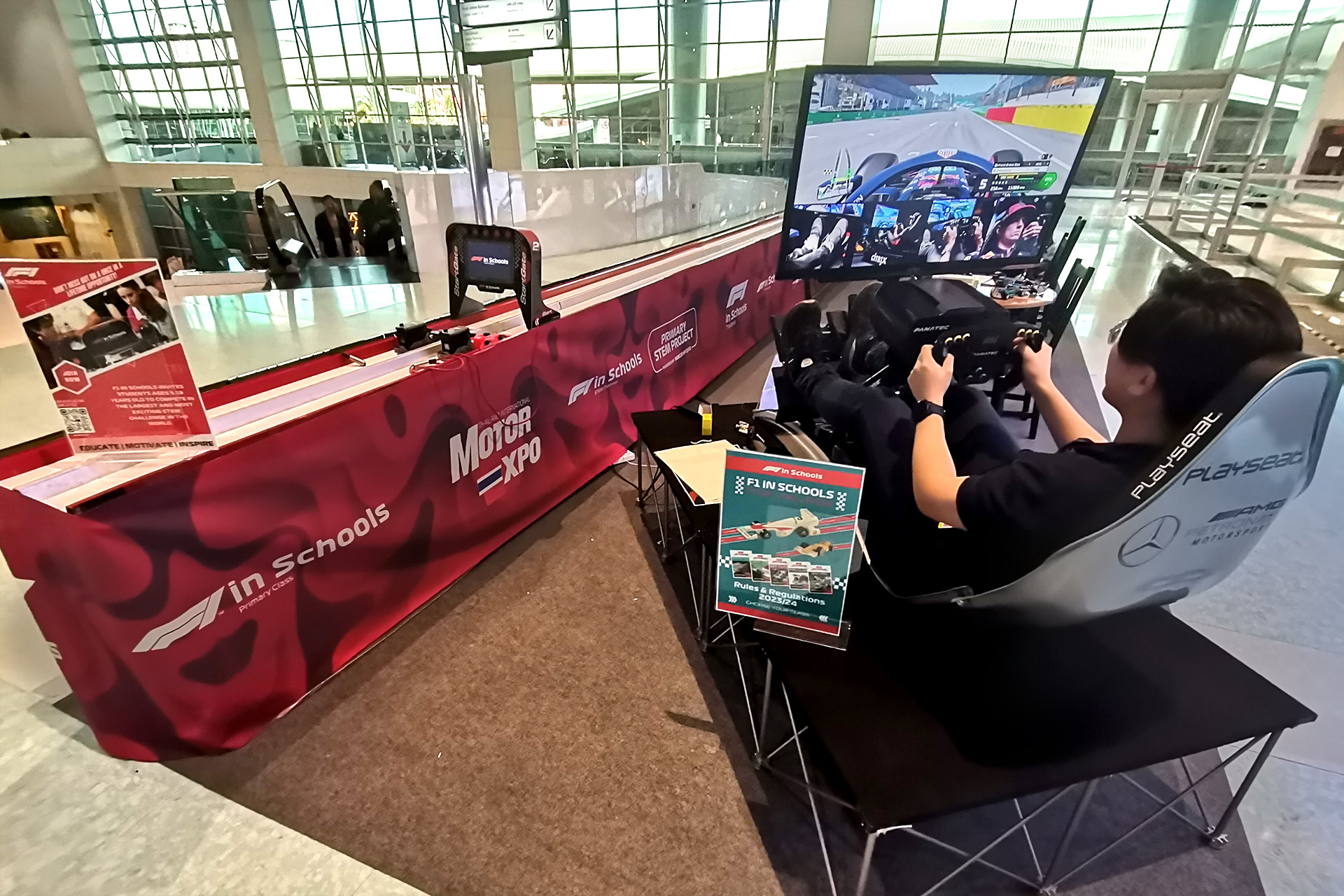 F1 IN SCHOOLS นิทรรศการ และผลงานของนักแข่งทีมไทยที่ไปแข่งขันในต่างประเทศ รวมถึงเรียนรู้ และฝึกทักษะการขับรถ F1 แบบง่ายๆ นิทรรศการนวัตกรรมสัมผัสอนาคต ชมผลงานสร้างสรรค์นวัตกรรม และสิ่งประดิษฐ์เกี่ยวกับยานยนต์ ของเยาวชนระดับอุดมศึกษา