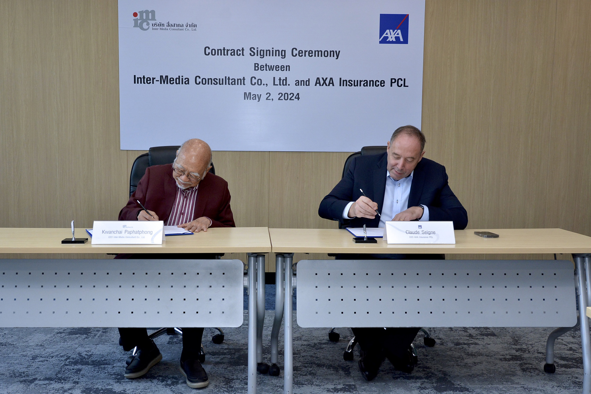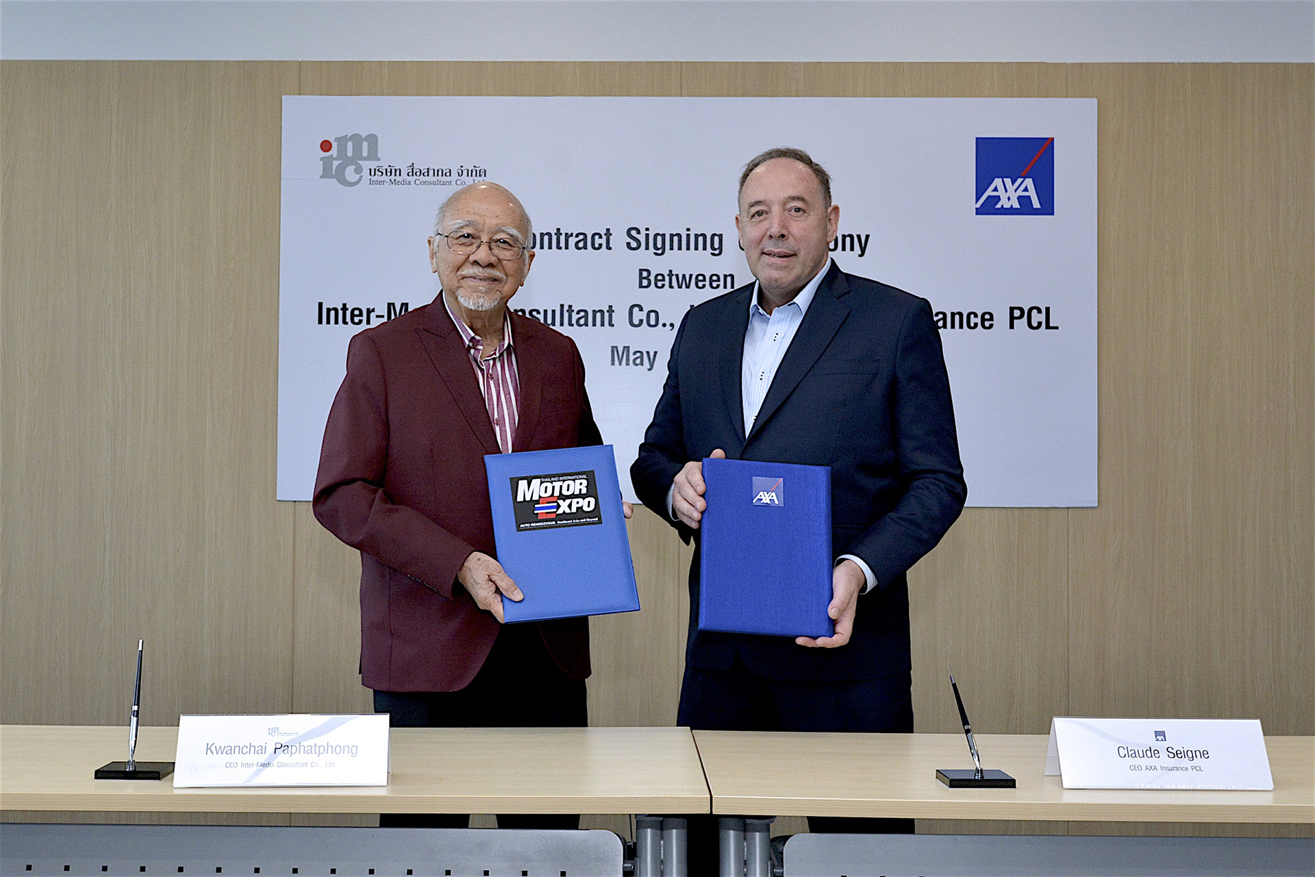 ขวัญชัย ปภัสร์พงษ์ ประธานจัดงาน “มหกรรมยานยนต์ ครั้งที่ 41” ร่วมด้วยคณะผู้บริหาร และ   โคลด เซนย์ ประธานเจ้าหน้าที่บริหาร บริษัท แอกซ่าประกันภัย จำกัด (มหาชน) เซ็นสัญญาบันทึกข้อตกลง เป็นผู้ร่วมอุปถัมภ์การจัดงานอย่างเป็นทางการ ด้านการประกันภัย ต่อเนื่องเป็นปีที่ 3
