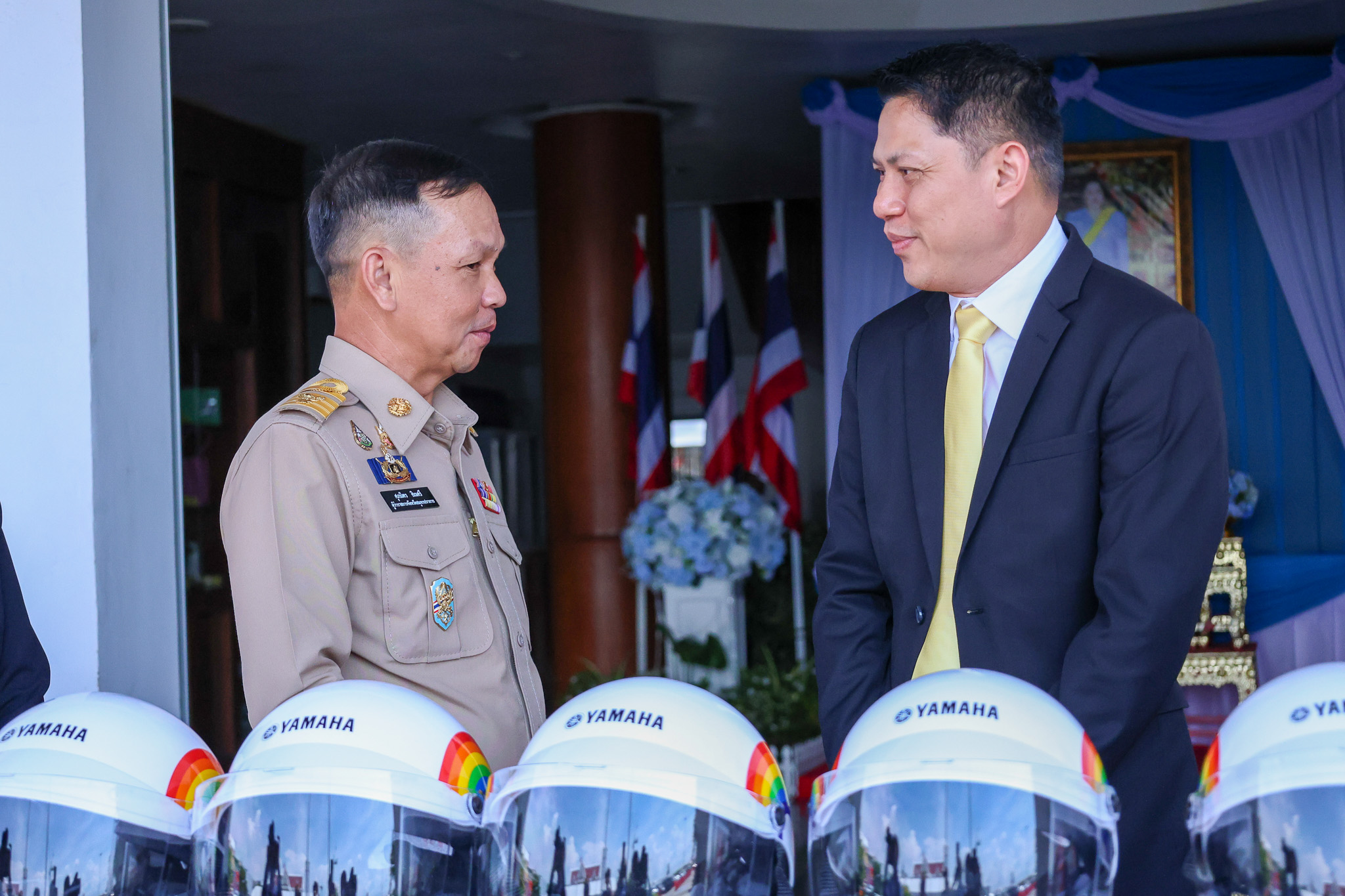 นายสุรชัย เพชรพงษ์ ผู้จัดการทั่วไปฝ่ายธุรการทั่วไป นางเจริญรัตน์ เลิศอานันท์ภร ผู้จัดการกลุ่มงานองค์กรสัมพันธ์ บริษัท ไทยยามาฮ่ามอเตอร์ จำกัด ถ่ายภาพร่วมกับ นายศุภมิตร ชิณศรี ผู้ว่าราชการจังหวัดสมุทรปราการ นายพชร ศศิชาชยามร หัวหน้างานปัองกัน และบรรเทาสาธารณภัย จ.สมุทรปราการ และนางสุกัณยา สิงห์ทอง หัวหน้าป้องกัน และปฏิบัติการ ในพิธีมอบหมวกกันน็อกขนาดเล็กที่ได้รับมาตรฐาน มอก.จำนวน 300 ใบ รวมมูลค่า 105,000 บาท เพื่อนำไปแจกจ่ายให้กับโรงเรียนประถมศึกษาในจังหวัดสมุทรปราการ และเยาวชน รวมถึงประชาชนในพื้นที่ จ.สมุทรปราการ เพื่อเป็นการร่วมรณรงค์ให้ผู้ขับขี่สวมหมวกนิรภัยเมื่อขับขี่รถจักรยานยนต์ทุกครั้ง รวมถึงเป็นการป้องกัน และลดการสูญเสีย เมื่อเกิดอุบัติเหตุจากท้องถนน พร้อมสร้างจิตสำนึกถึงความปลอดภัย และเสริมสร้างวินัยจราจร